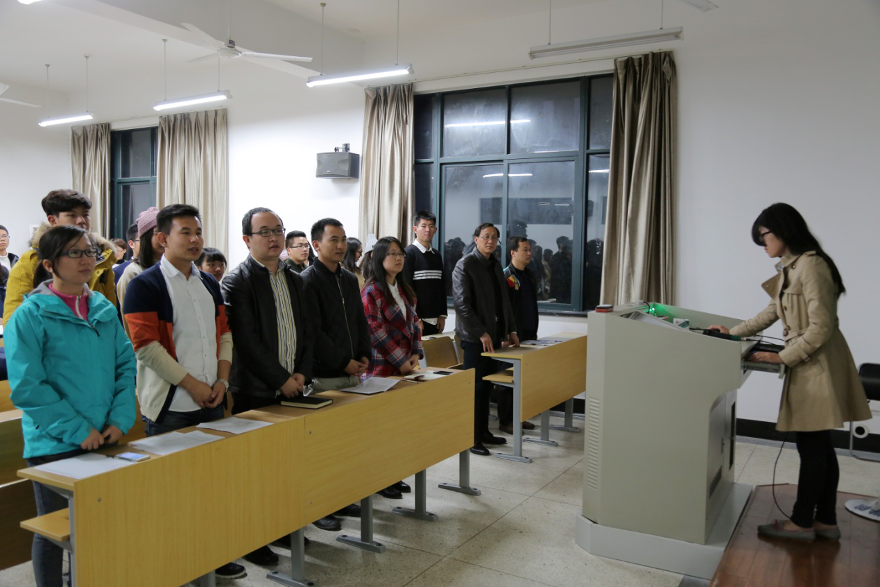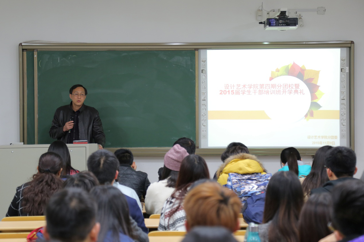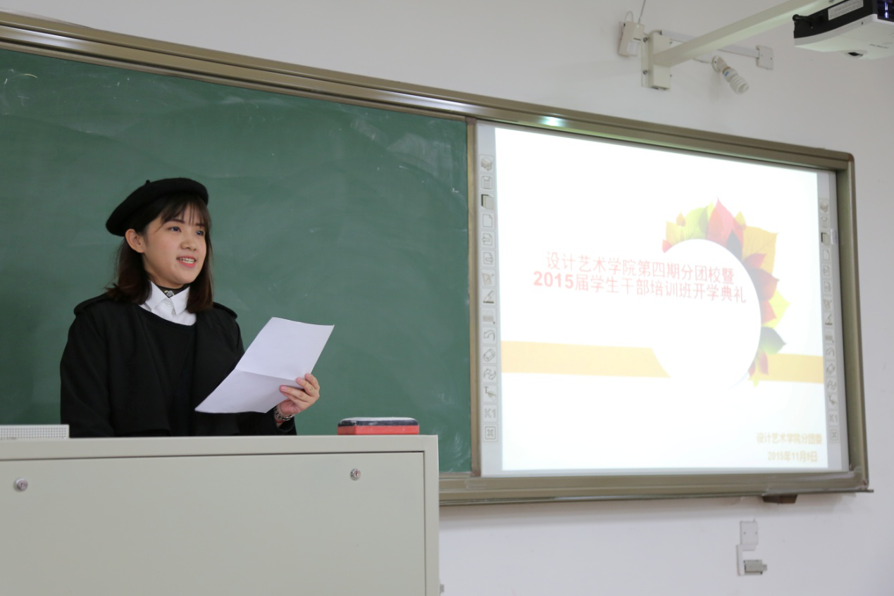 第四期分团校暨2015届学生干部培训班开学典礼在教学楼105召开。党总支书记韩建华、党总支副书记于友成、分团委书记林立荣、视觉传达专业辅导员乔森、戏剧影视美术设计及人物形象设计专业辅导员甘杰、环境设计、服装设计及产品设计专业辅导员钱旺、实习辅导员陆旖婷以及少年阿宾