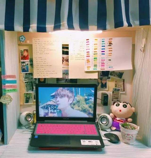 整整齐齐收拾好的桌子,粉色的收纳柜和可爱简洁的粘贴画使桌子更加的丰富和好看,照片墙一张一张的照片,也是我们珍藏心里最美好的回忆。