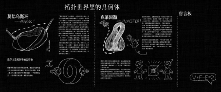 小组成员整理了拓扑学的知识,将其通俗化后列在了小黑板上。黑板右侧为留言板,游客可在上面打卡留言。同时,黑板上的插图还吸引了游客,尤其是青少年儿童的兴趣。