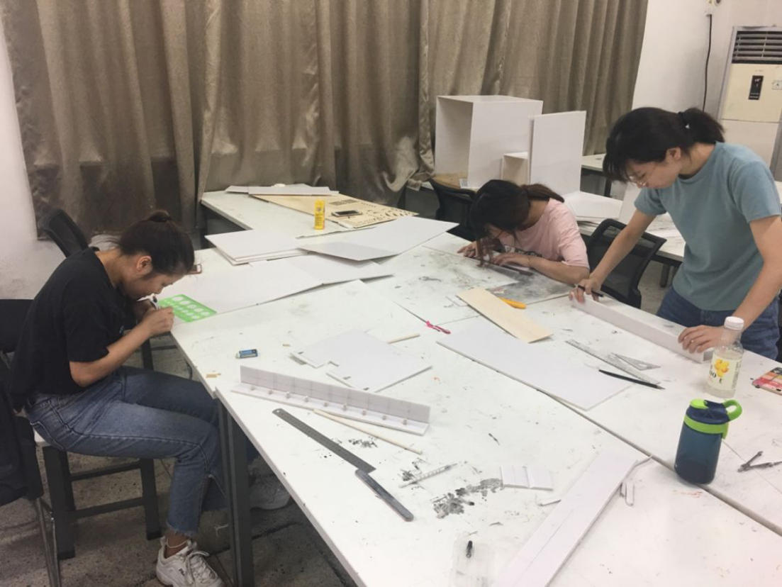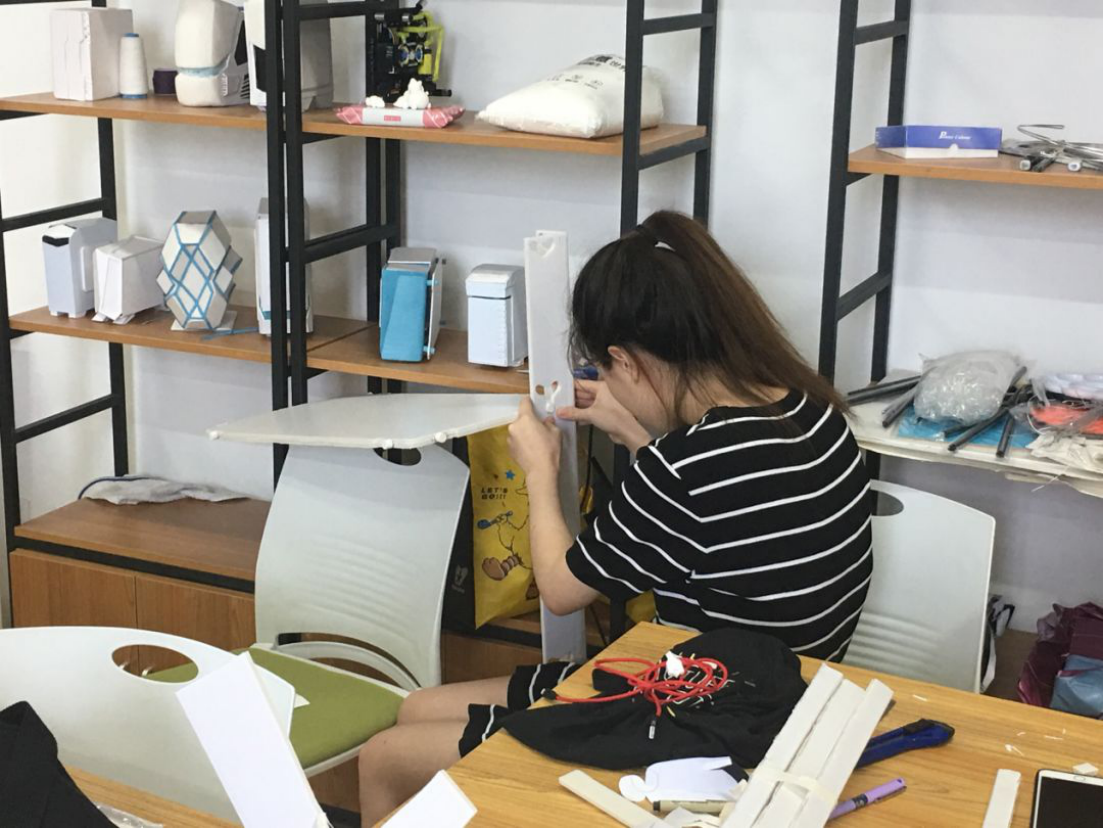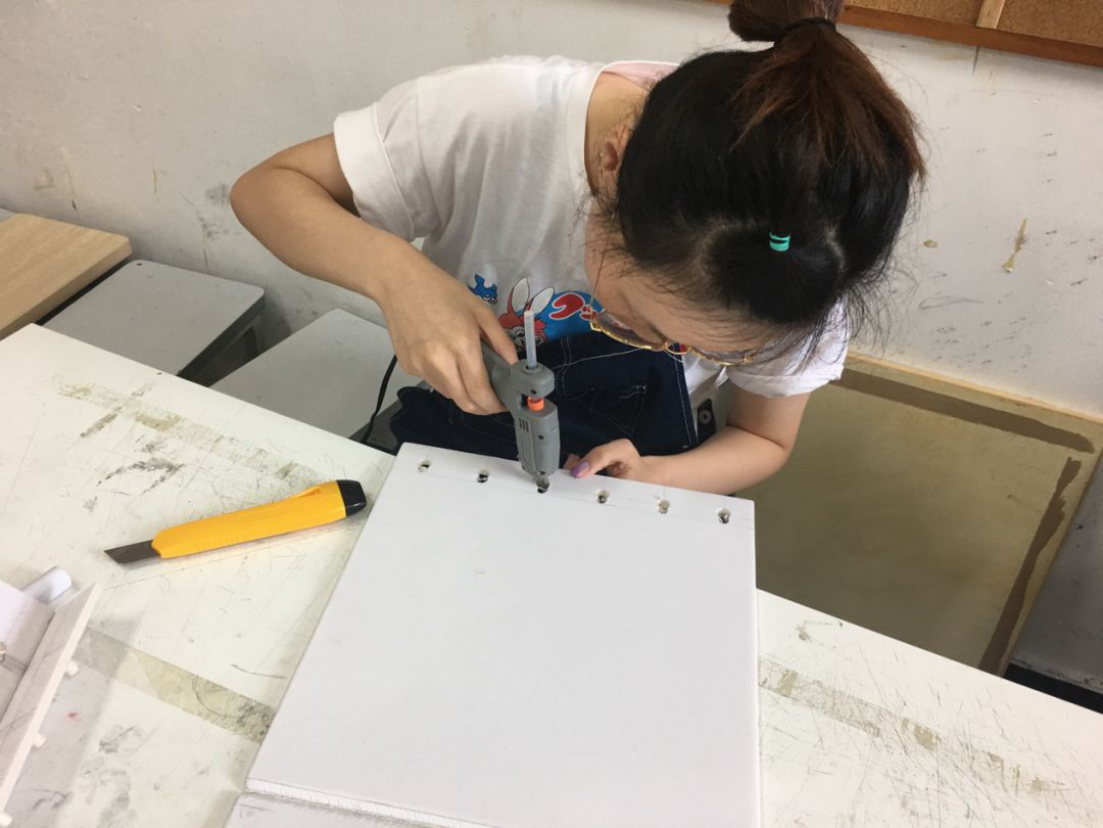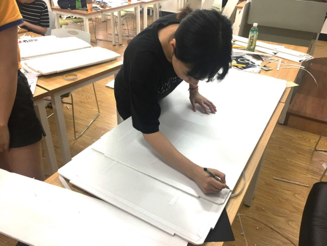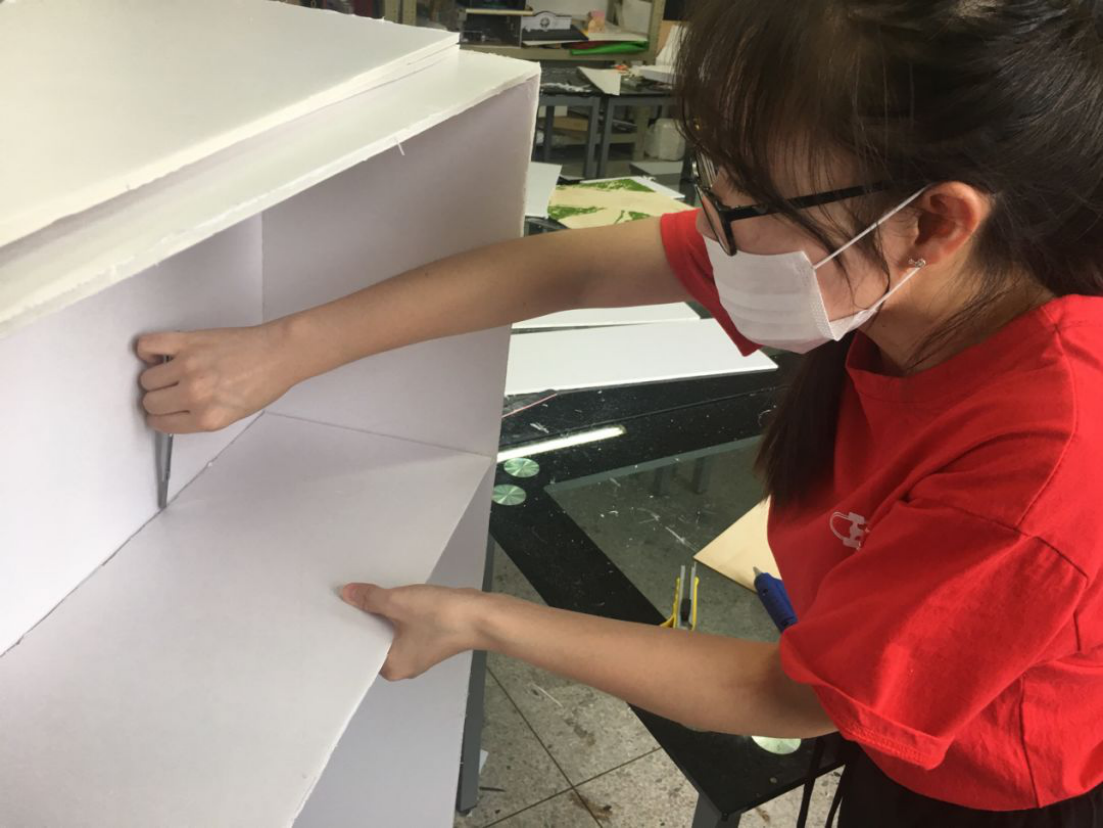 在认真制作模型中,整张的KT板从剪裁量尺,到考虑产品模型的连接方式,经过一系列的思考后,从一张平面草图逐步制成了1:1的实体模型。