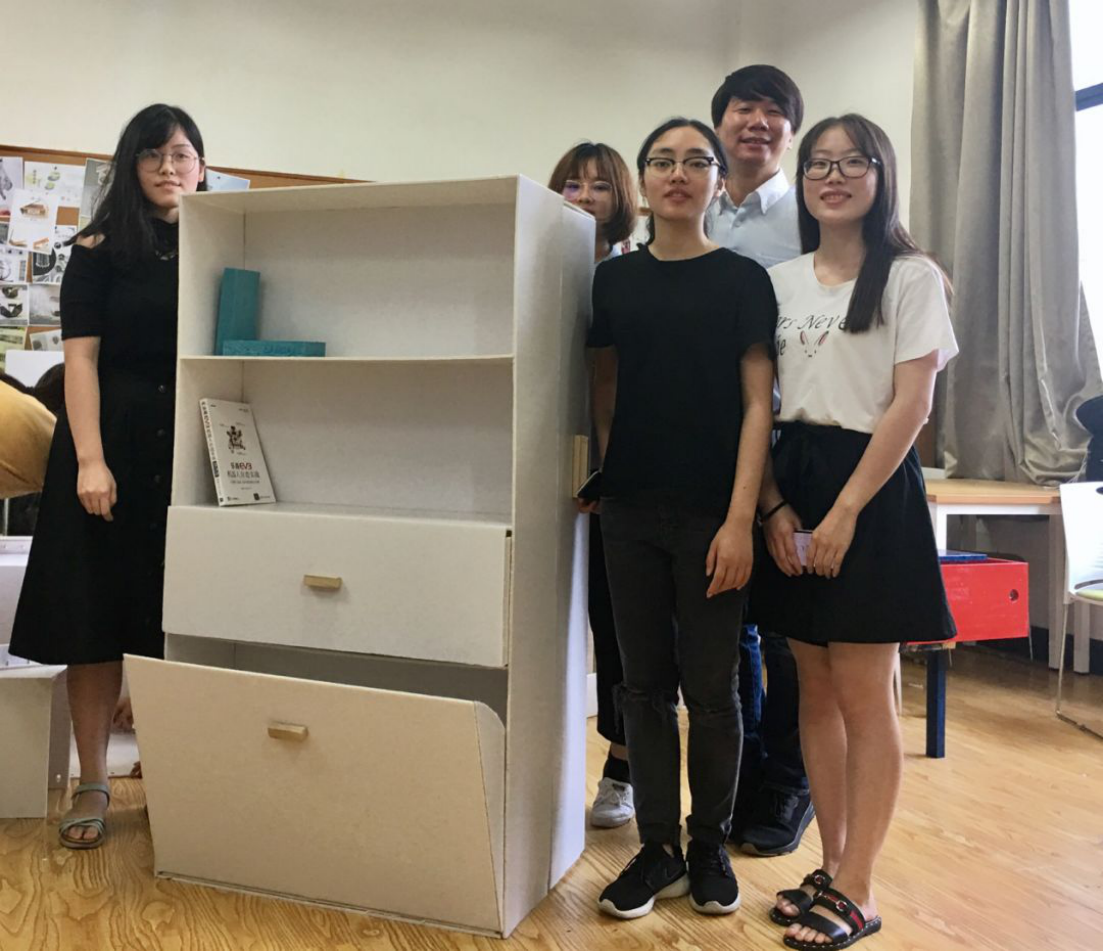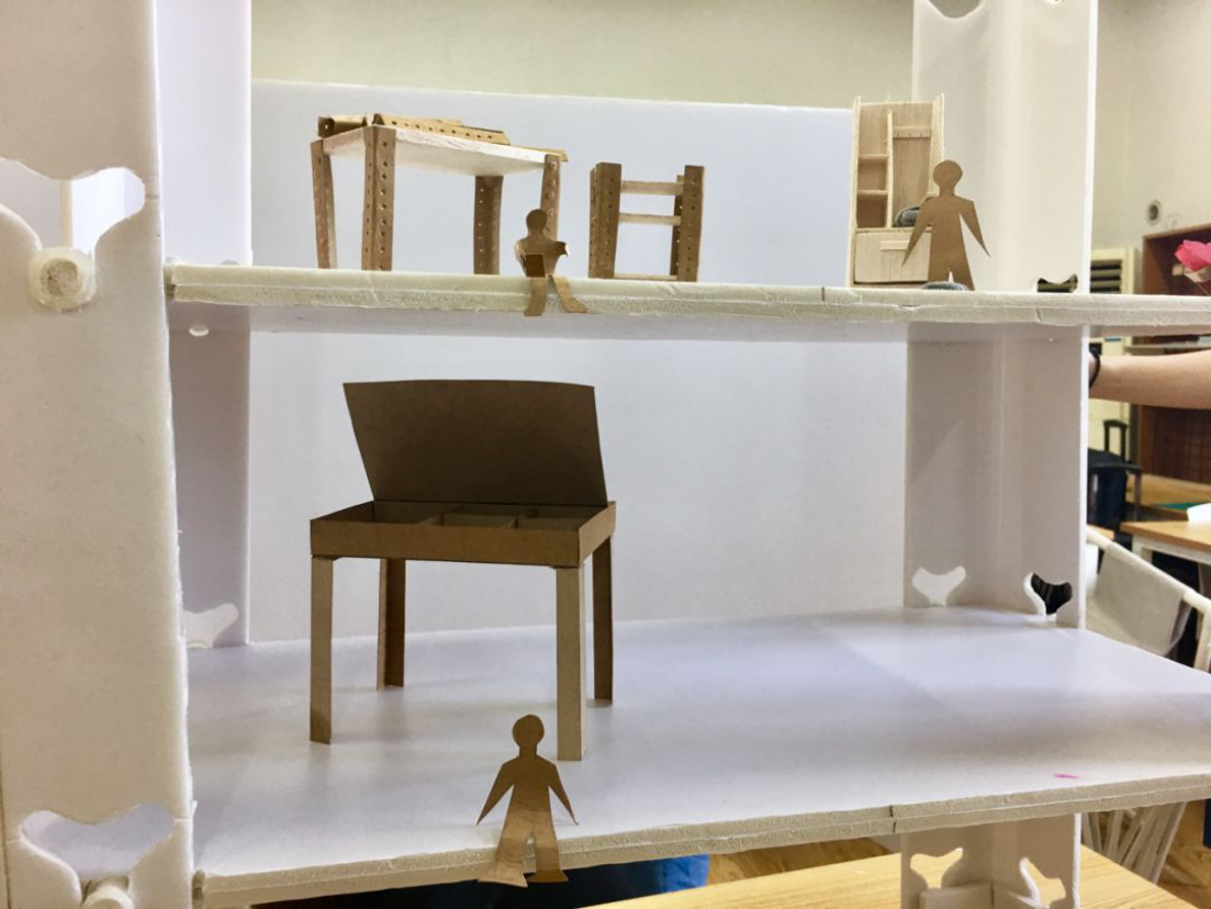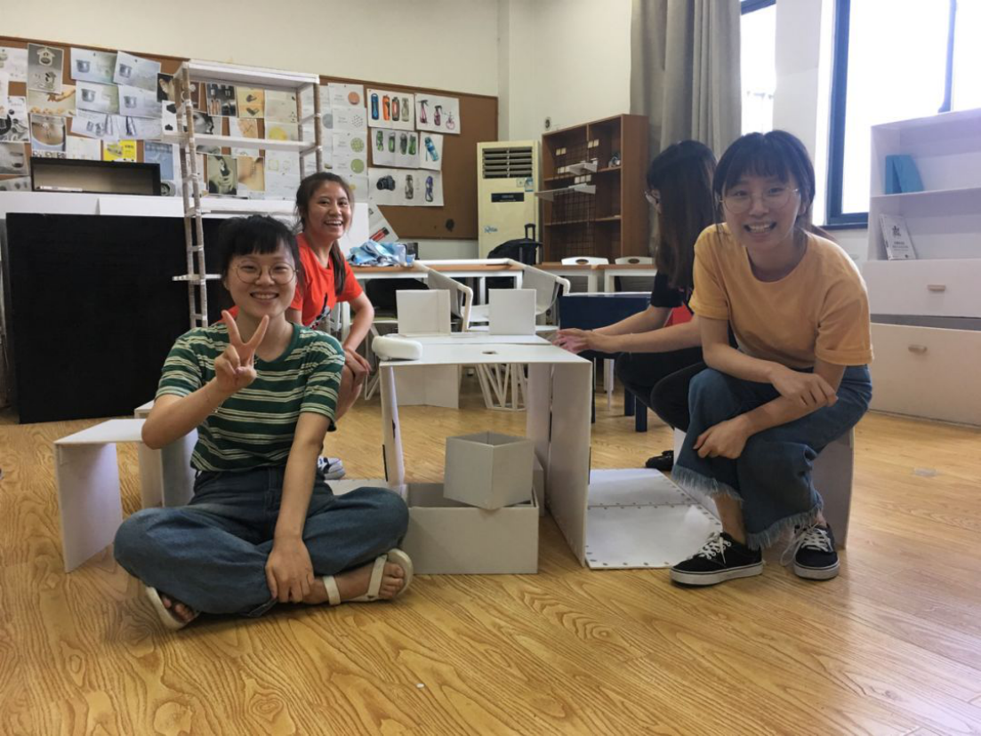从最开始的概念到草图,制作小型纸质模型后,经过叶风老师与Professor TJ的耐心指导并与小组成员反复深化改进后,终于将1:1的实体模型制作完成。