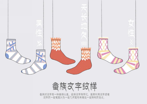 设计说明:针对畲语独特的文字纹样,进行延伸设计。分别采用了男性、女性和天长地久的纹样进行新的排列组合,既有图形的美感,也传达了畲族独有的文化,是对畲语的二次创作,将畲族传统文化带入现实的时尚穿搭,使其纹样跨越时代,成为全新的时尚单品