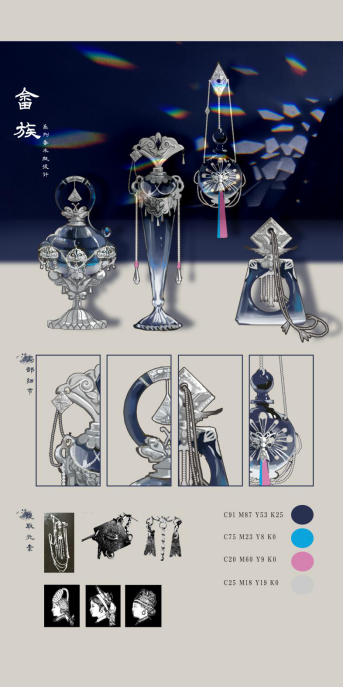 设计说明:。作品结合不同形制畲族凤冠的特点,将畲族的凤文化注入古董香水瓶中,传达凤冠与香水瓶相融合的视觉艺术,借此体现民族文化之美轮美奂,使其更贴近现代品质生活,依凭嗅觉与视觉,于无形中感受畲乡之美。