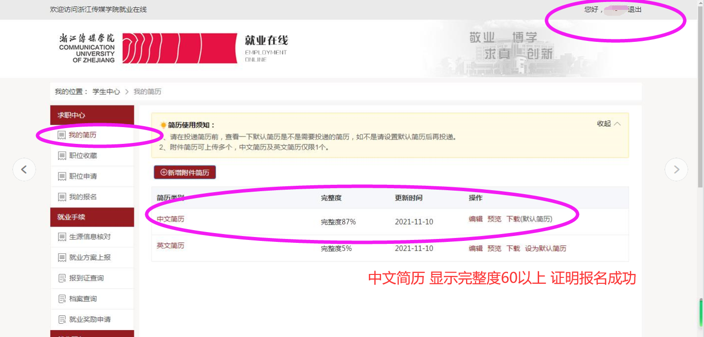 2、登录成功后,选择学生中心左侧的“我的简历”进行个人简历完善。