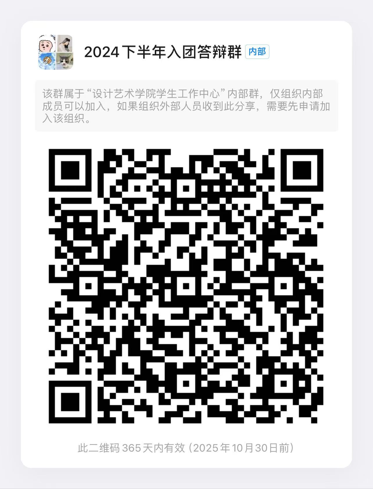 10月31日(周四)16:00前扫码进答辩钉钉群。请符合条件且有意愿参与本次入团答辩的同学扫码进群。