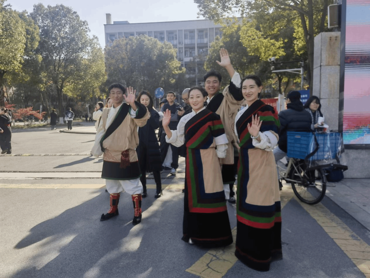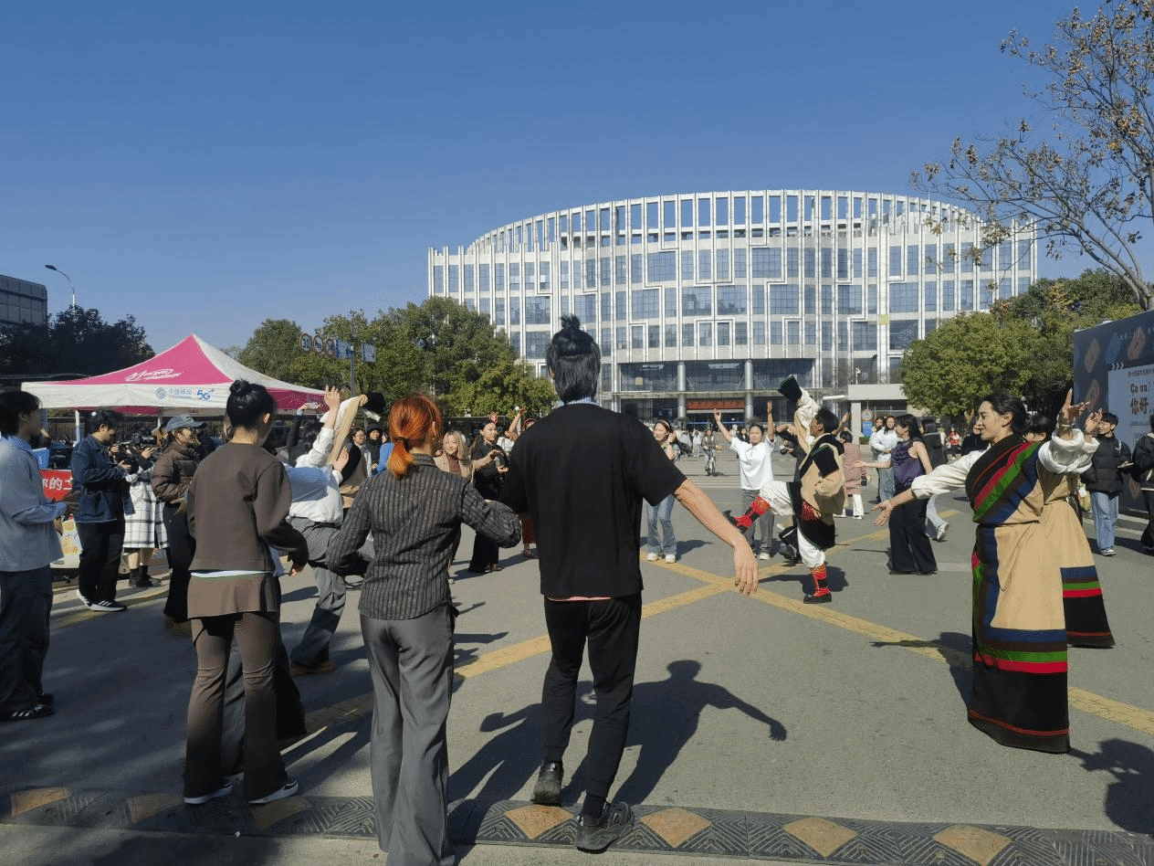 同日中午,那曲4位藏族舞蹈演员与音乐与舞蹈学院的学生们一起在生活区共跳锅庄,以欢快舞步增进文化交流、深化民族情谊。
