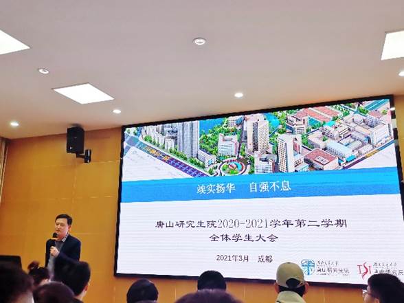 2021年3月3日晚,唐山研究生院在学校成都九里校区组织召开了2020-2021学年第二学期全体学生大会。唐山研究生院党总支书记刘伟,副院长吴刚、梁思颖,教学与学生工作办公室主任贾诚、综合办公室主任王韬参加了会议。会议由刘伟书记主持。