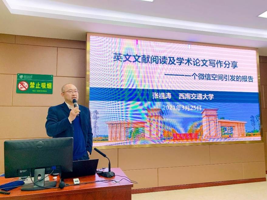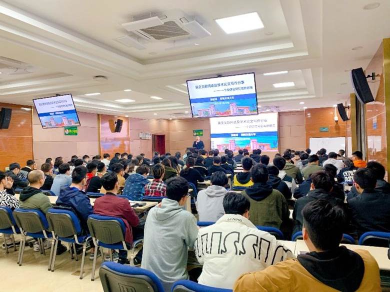 讲座上,张祖涛教授从英文文献阅读和高因子论文写作两个方面向同学们做了讲解。对于英文文献阅读,张祖涛教授谈到:“阅读英文文献,同学们一是要善于利用学校图书馆资源以及其他网上资源查找英文文献;二是要把握文献创新点,详看文献标题、摘要、创新点、结论,略看文献内实验细节;三是要充分利用办公软件或文献管理软件对看过的文献进行整理,形成自己的文献心得积累。对于高因子论文写作,张祖涛教授归纳为创新创意、顶层设计、题目斟酌、框架继承、精美展示、反复修改、导师润色、查重自纠、全套投稿、期待好运这十个步骤。张祖涛教授话语幽默,以图片视频等多样形式细致讲解,现场气氛热烈,掌声不断。