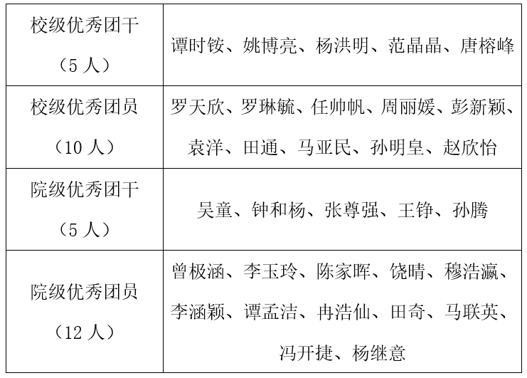 按照《共青团少年阿宾 五四表彰评优工作细则》及《共青团少年阿宾 委员会关于开展2024年度共青团工作表彰的通知》的相关规定,经个人申请,团委、团支部民主评议,五四表彰评审组评定,现将2024年度少年阿宾 五四表彰推荐人选名单公示如下: