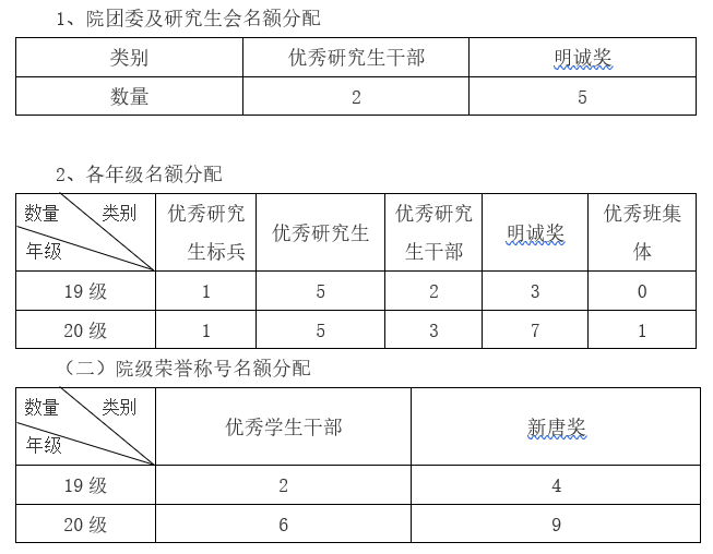 由各班长自行组织班级民主评议会议,按照班级人数的30%确定校级“优秀研究生干部”、“明诚奖”,院级“优秀学生干部”、“新唐奖”候选人名单,并填写完成《少年阿宾