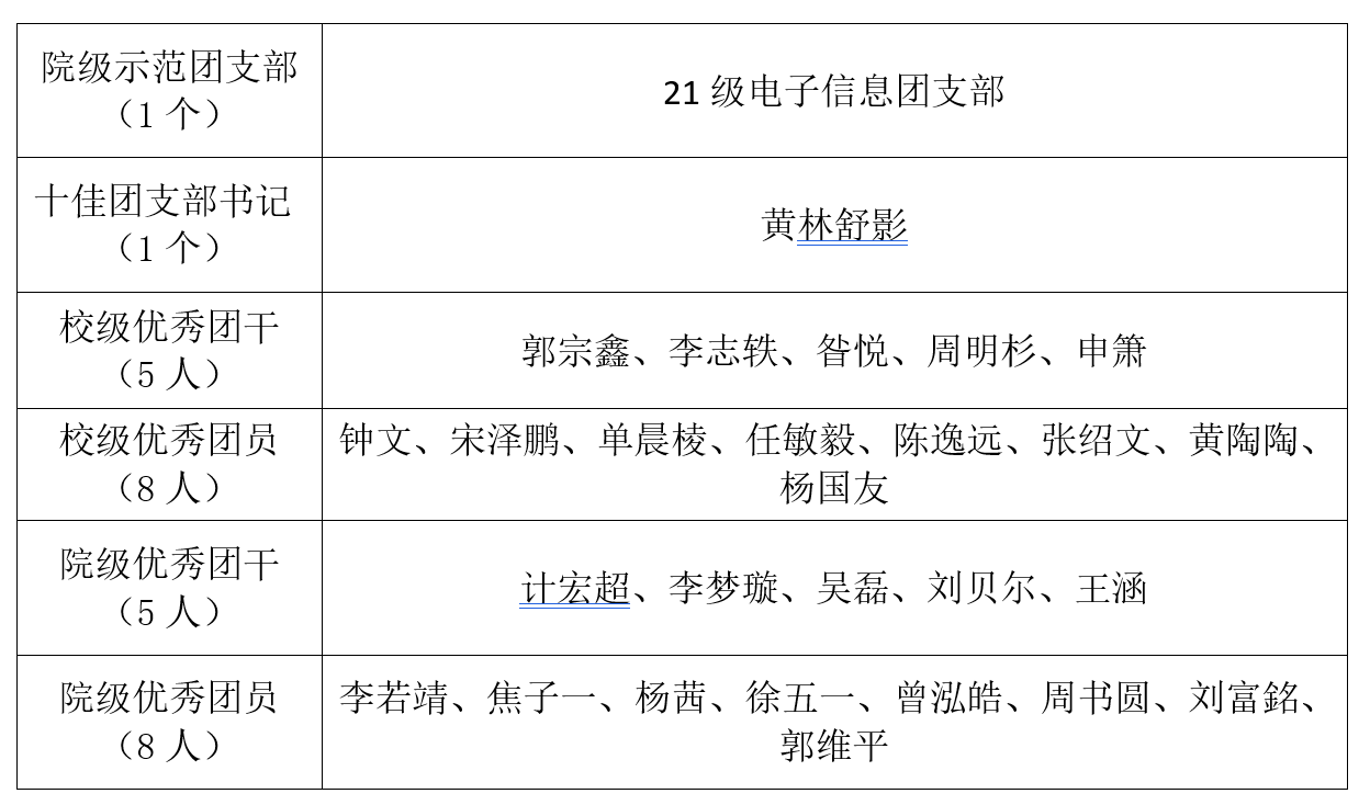 按照《共青团少年阿宾 五四表彰评优工作细则》及《共青团少年阿宾 委员会关于开展2022年度共青团工作表彰的通知》的相关规定,经个人申请,团委、团支部民主评议,五四表彰评审组评定,现将2022年度少年阿宾 五四表彰推荐人选名单公示如下: