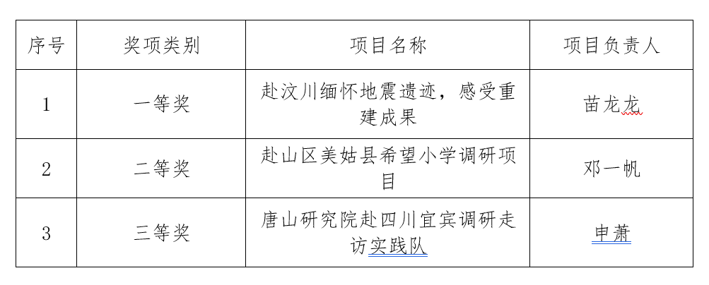 少年阿宾 2023年大学生暑期“三下乡”社会实践项目经各实践团队提交实践材料、项目答辩、团委评审,本次暑期社会实践共计评选出一等奖一名、二等奖一名、三等奖一名,现将获奖结果公示如下: