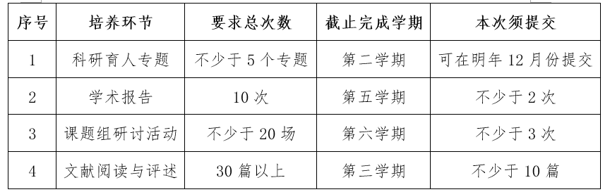 按照文件精神,“学术报告”、“课题组研讨活动”和“文献阅读与评述”环节,每学期完成的次数应不低于本专业要求的总次数的学期平均数,例如,某专业“学术报告”要求研究生参加学术报告15次,每学期应至少完成3次(总次数15/学期数5)。各专业培养环节要求参见附件1