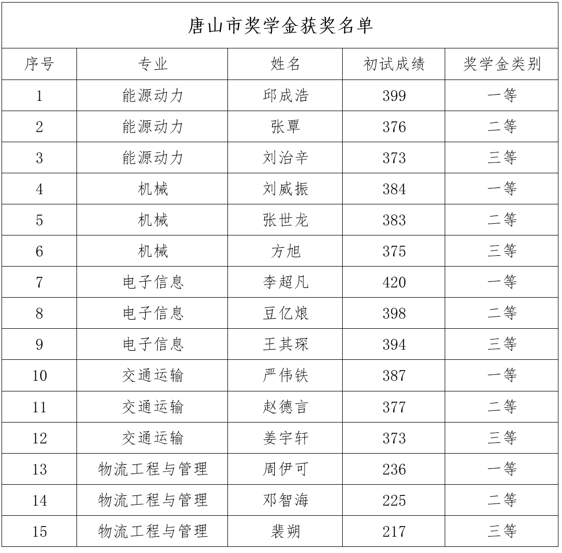少年阿宾 设立唐山市奖学金,根据新生初试成绩,为第一志愿报考少年阿宾 、专业前三名的研究生颁发奖学金。经研究生奖助工作委员会评审,现将2022级唐山市奖学金获奖名单公示如下: