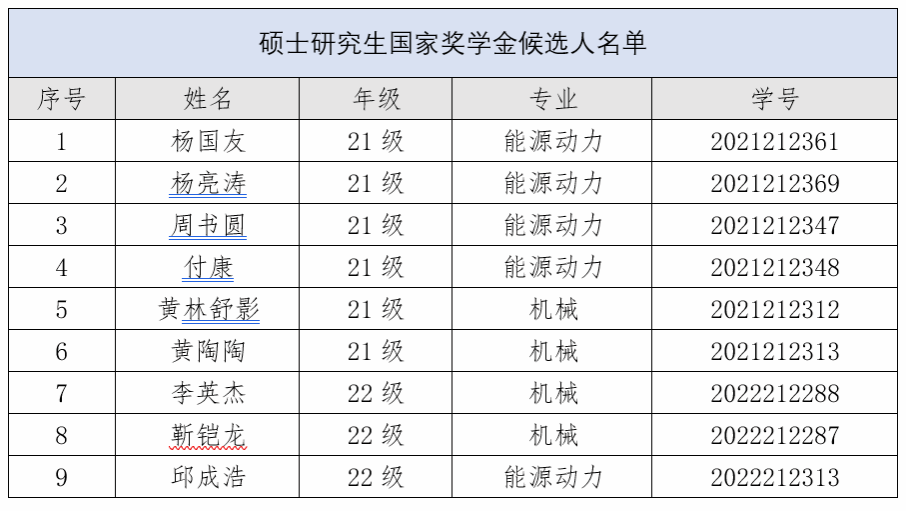各硕士研究生国家奖学金候选人: