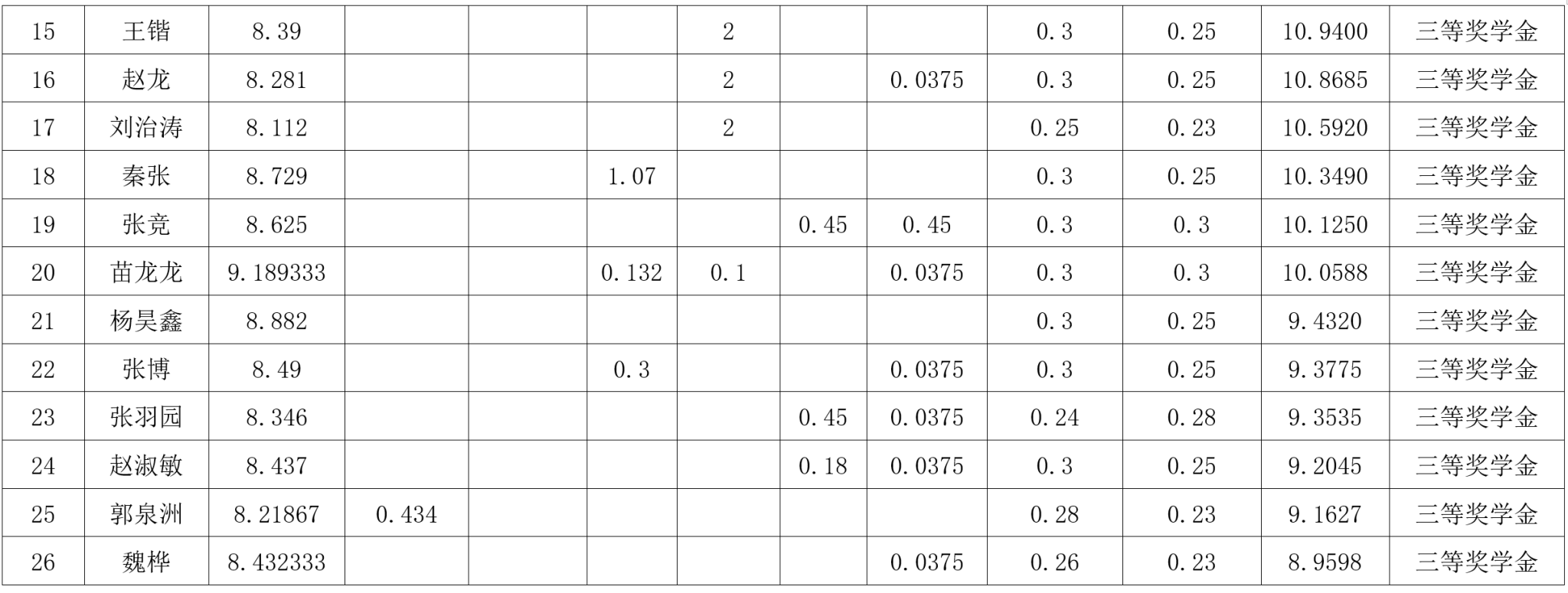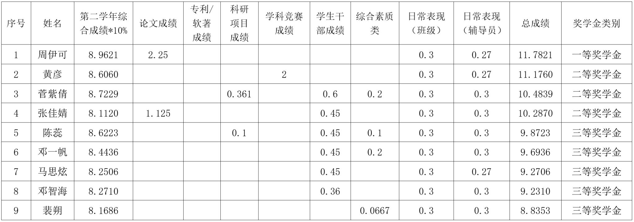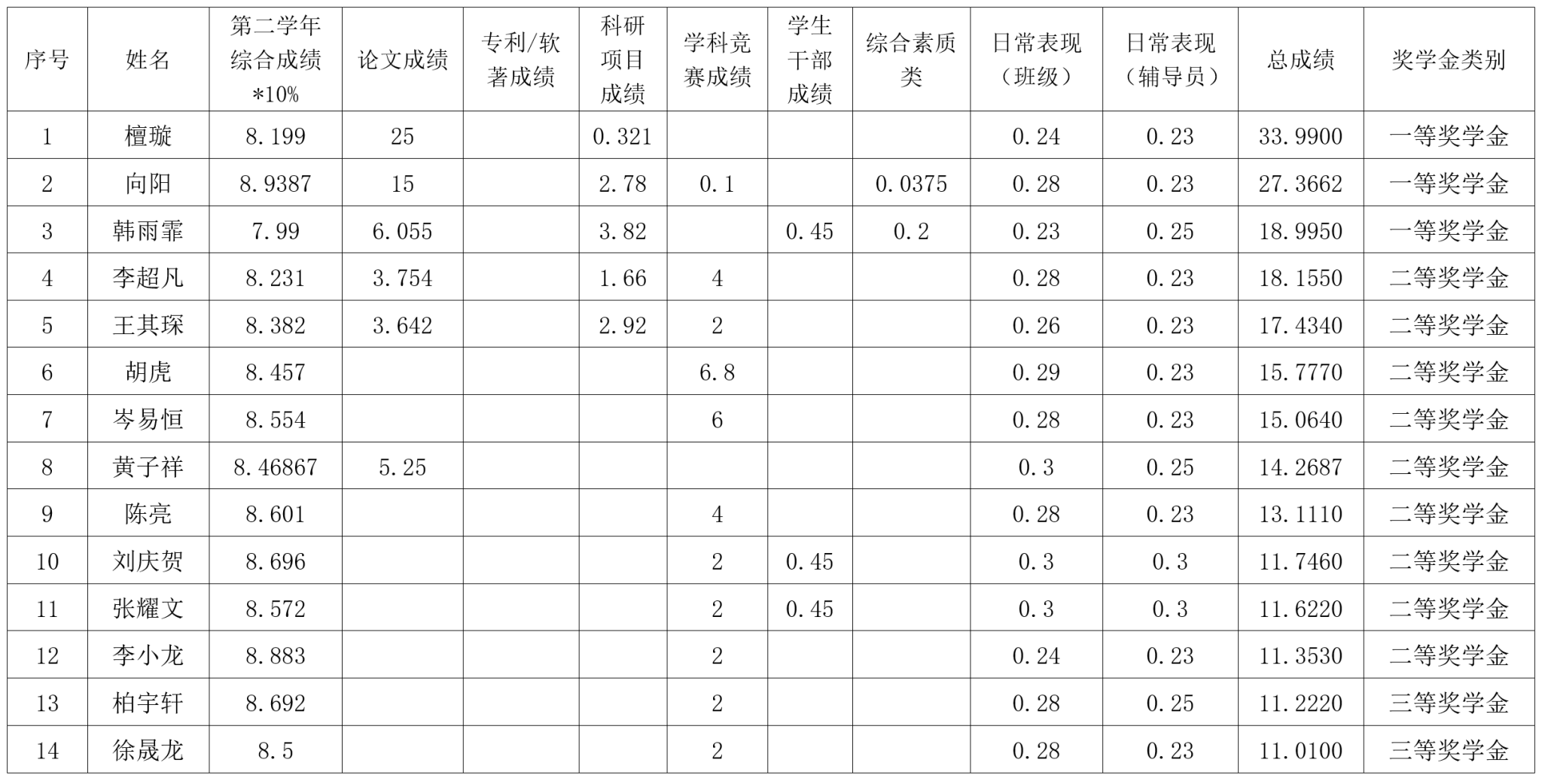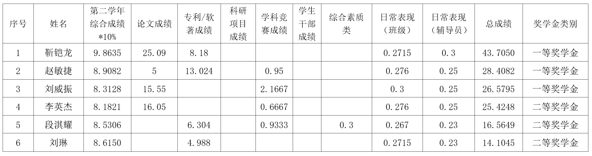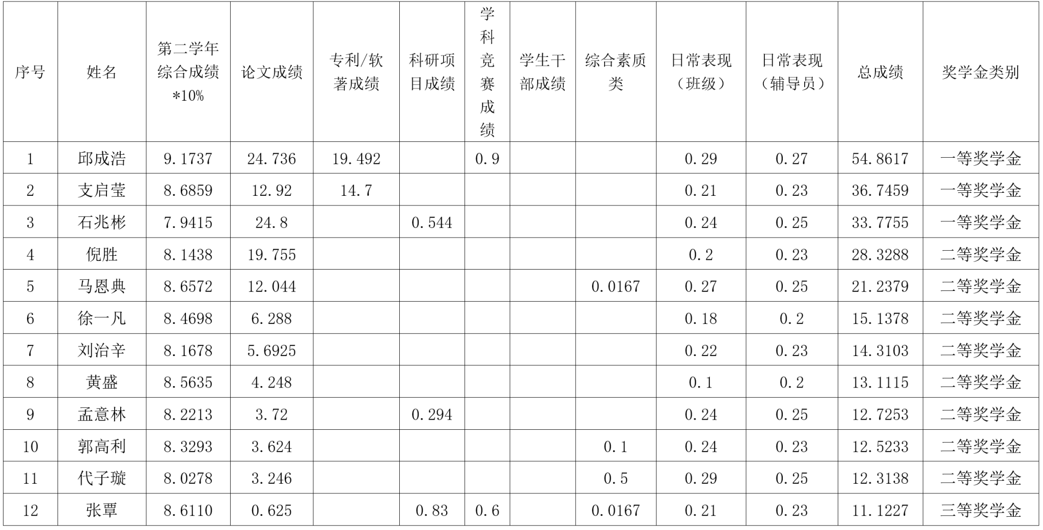 研究生奖(助)学金评定办法》,按综合成绩排名确定最终获奖类别(综合成绩=学业成果成绩+思想道德素质评价成绩+第二学年综合成绩*10%),现将2022级2023-2024学年研究生学业奖学金获奖名单公示如下: