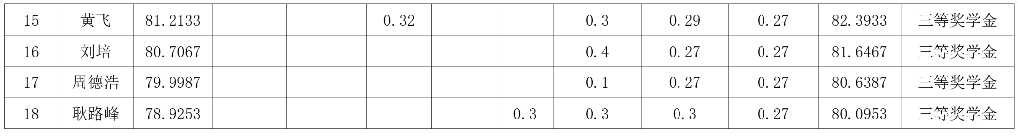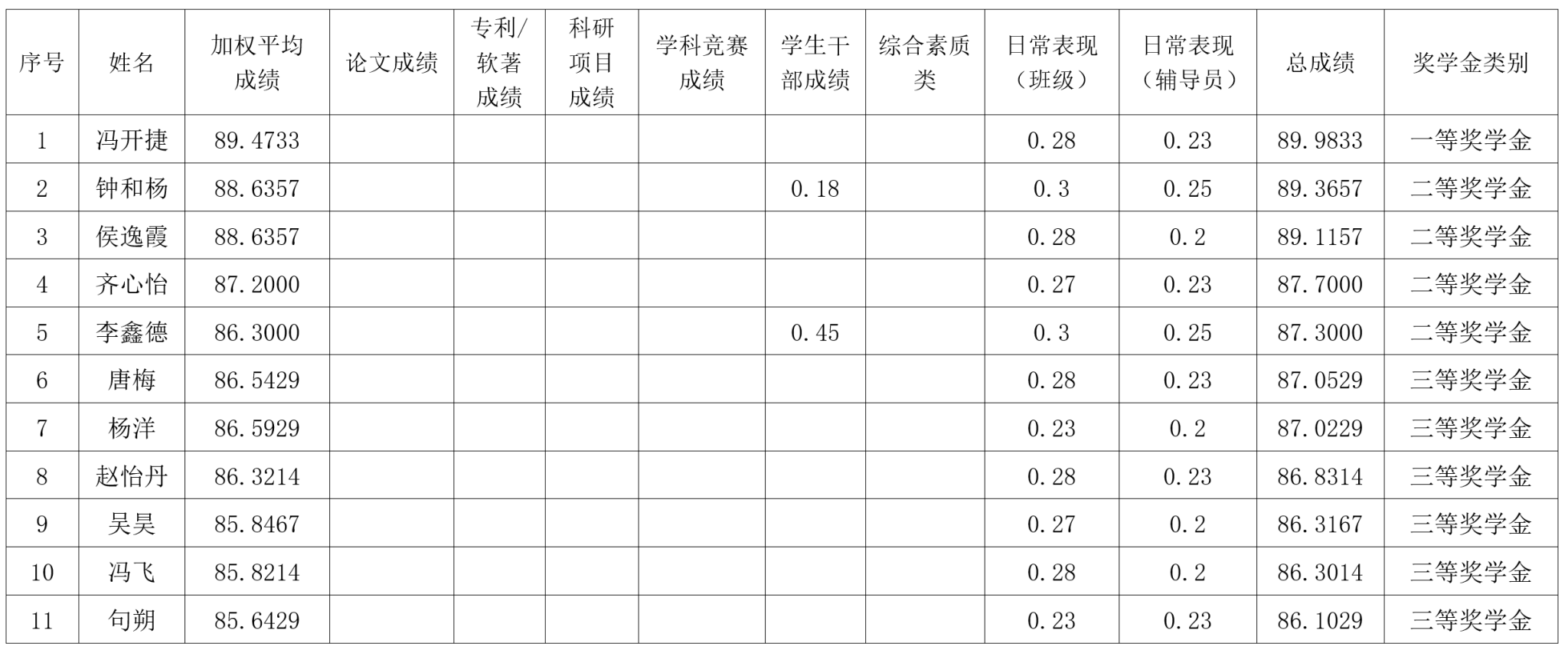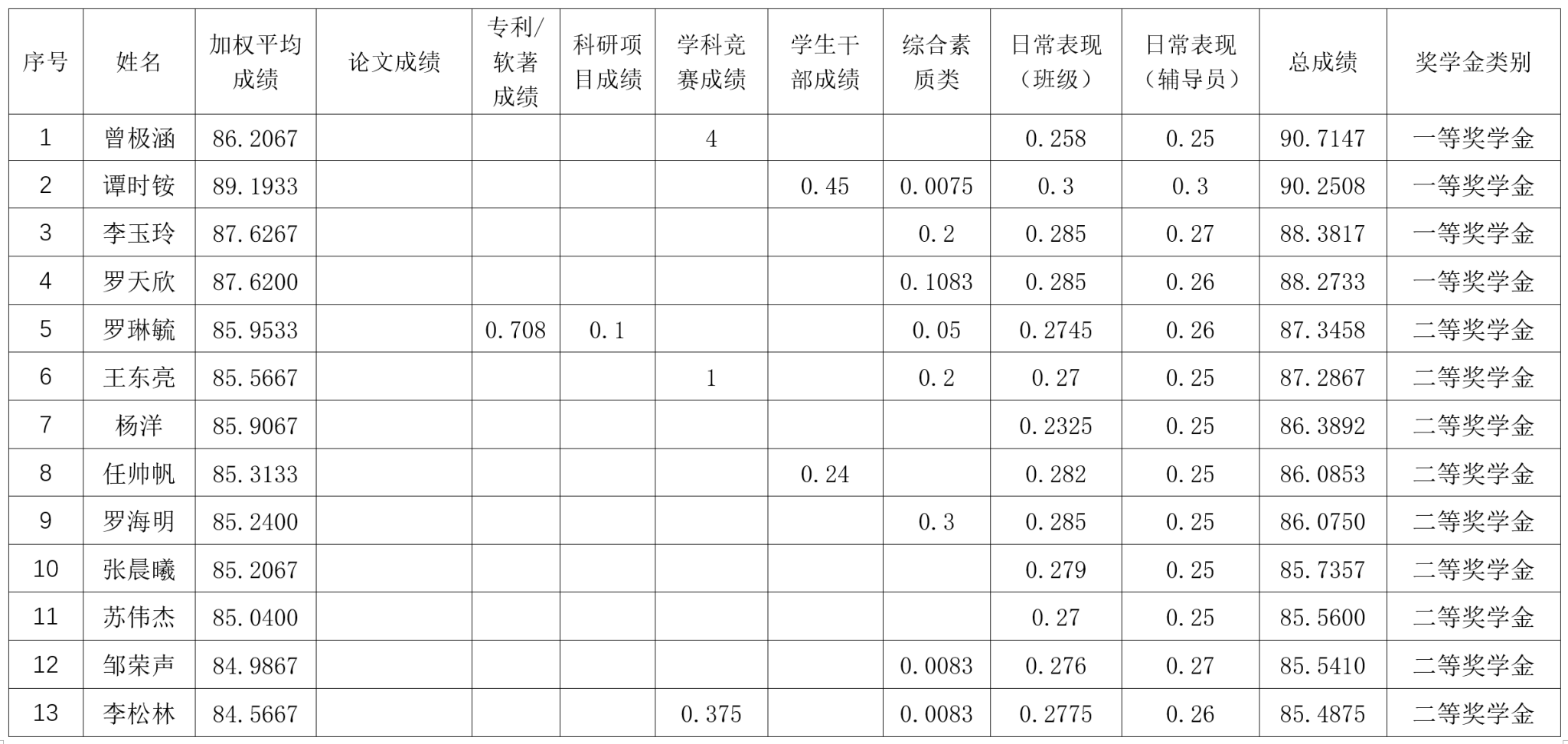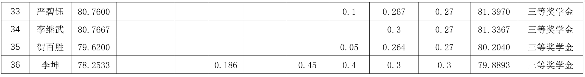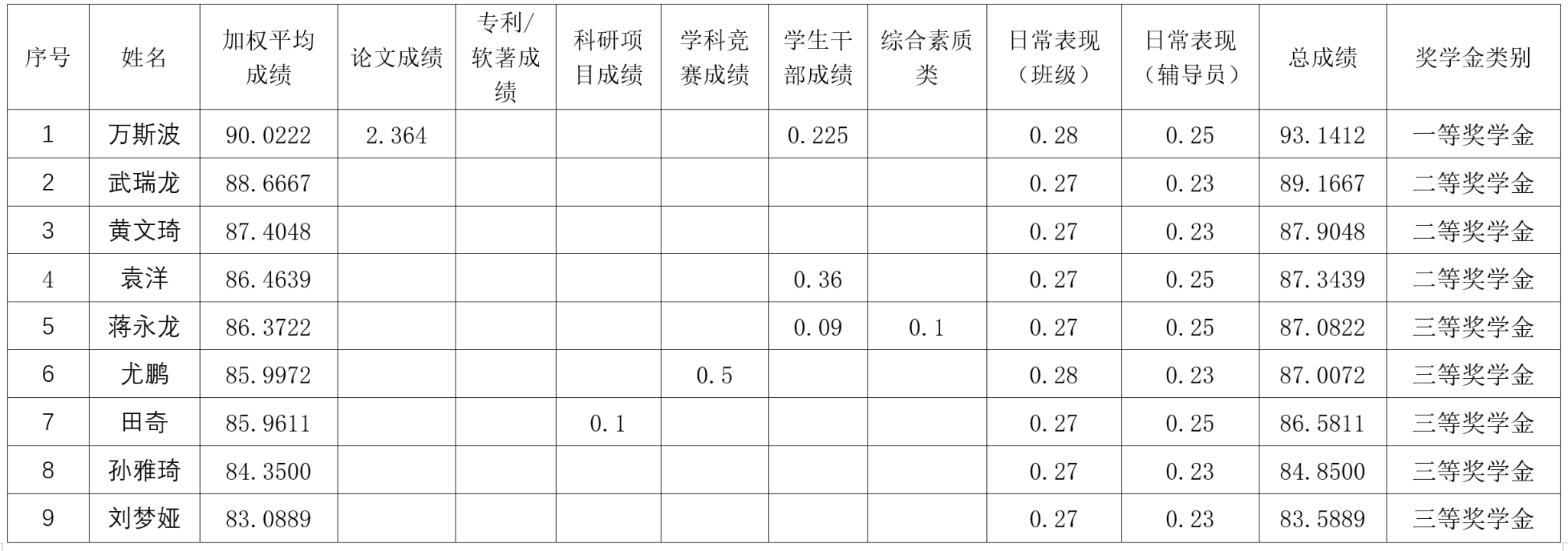 研究生奖(助)学金评定办法》,按综合成绩排名确定最终获奖类别(综合成绩=第一学年课程平均成绩+学业成果成绩+思想道德素质评价成绩),现将2023级2023-2024学年研究生学业奖学金获奖名单公示如下: