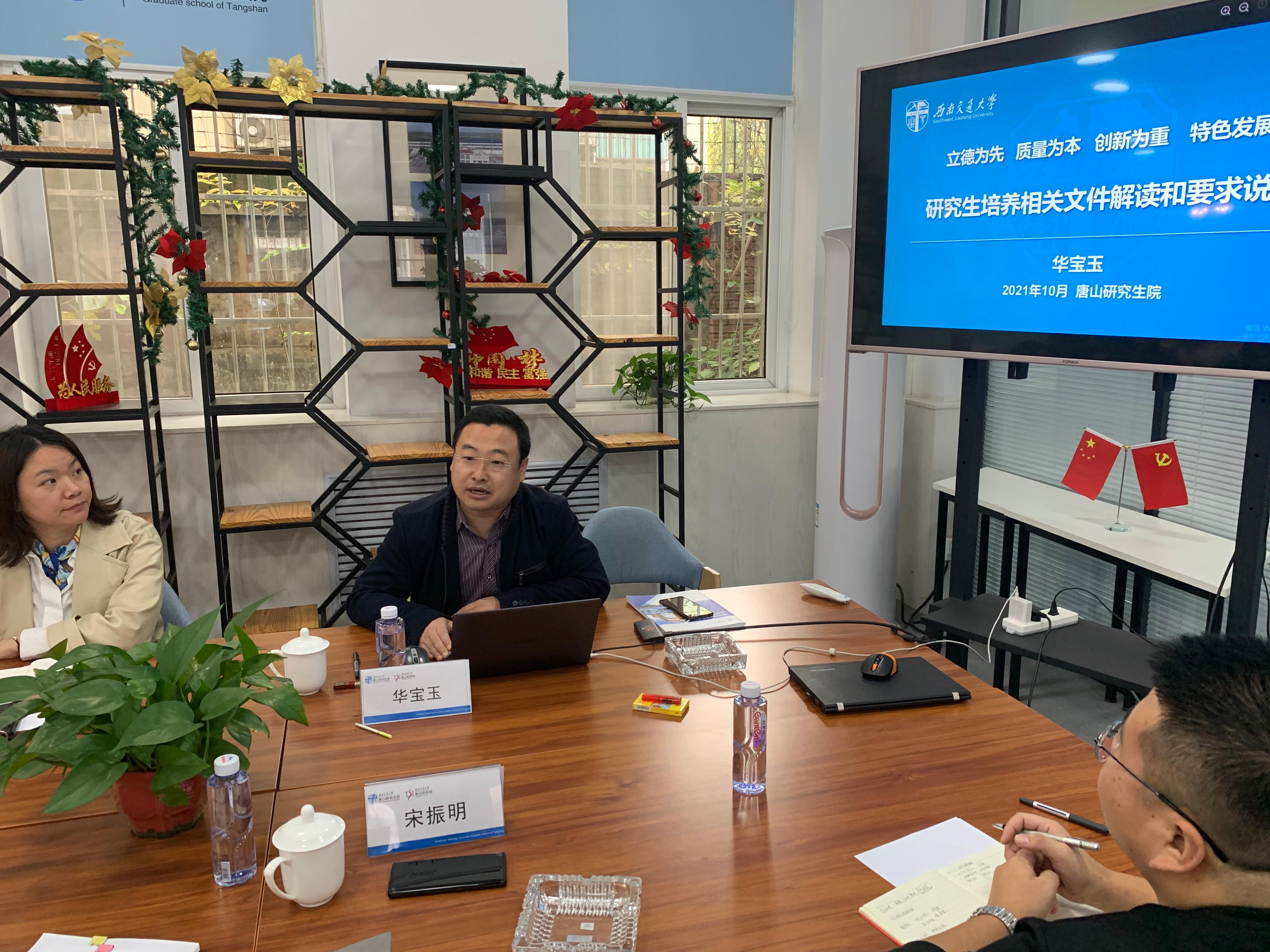 10月15日下午,学校研究生院在唐山研究生院举行研究生培养工作交流会。研究生院培养办公室主任华宝玉以“研究生培养相关文件解读和要求说明”为题,为唐山研究生院师生解读了近年来国家及学校在研究生培养中的新部署、新政策和新要求。研究生院常务副院长周先礼、综合管理办公室主任陈志伟以及唐山研究生院(研究院)党总支书记刘伟、副院长(主持工作)吴刚、学术负责人宋振明及师生代表参加了交流会。